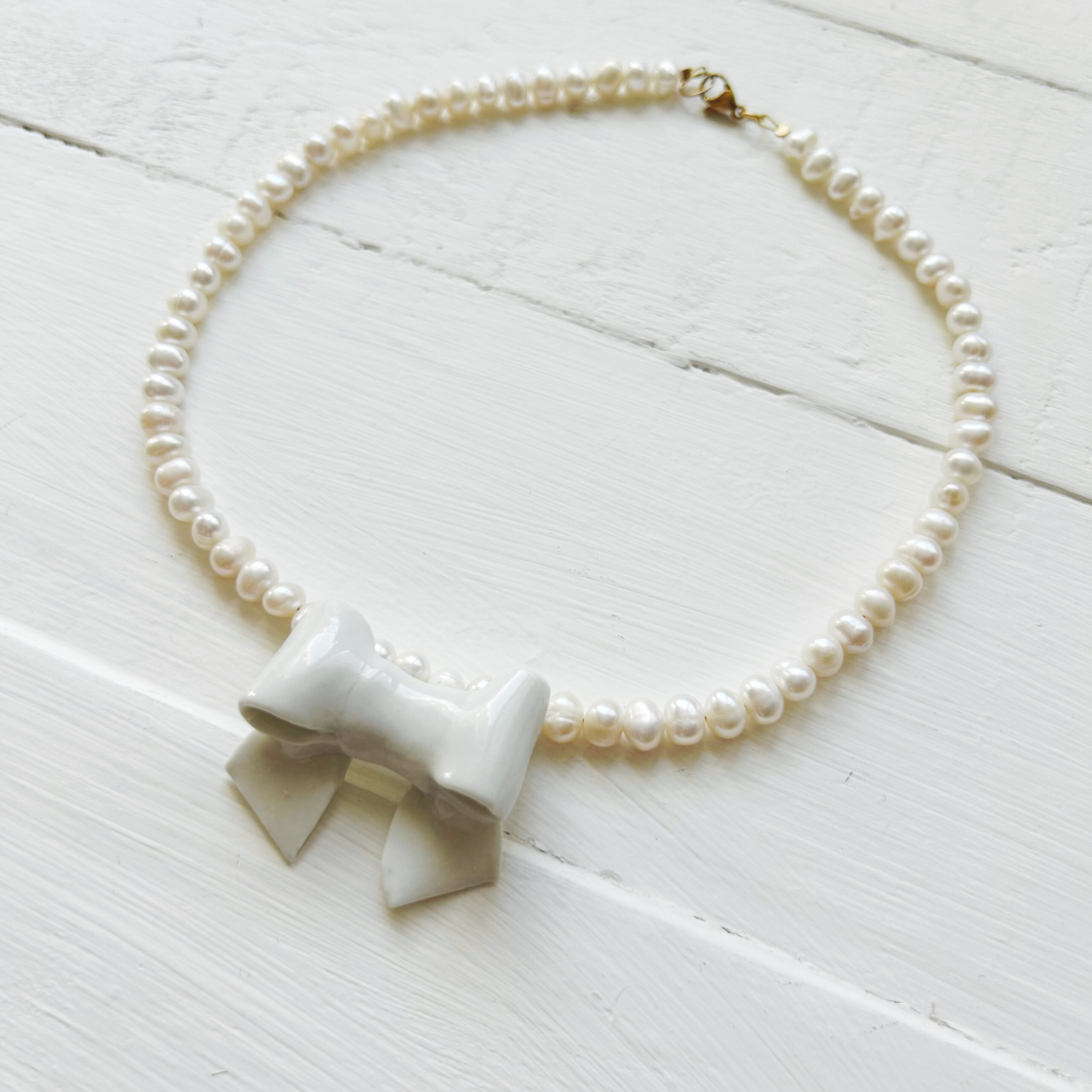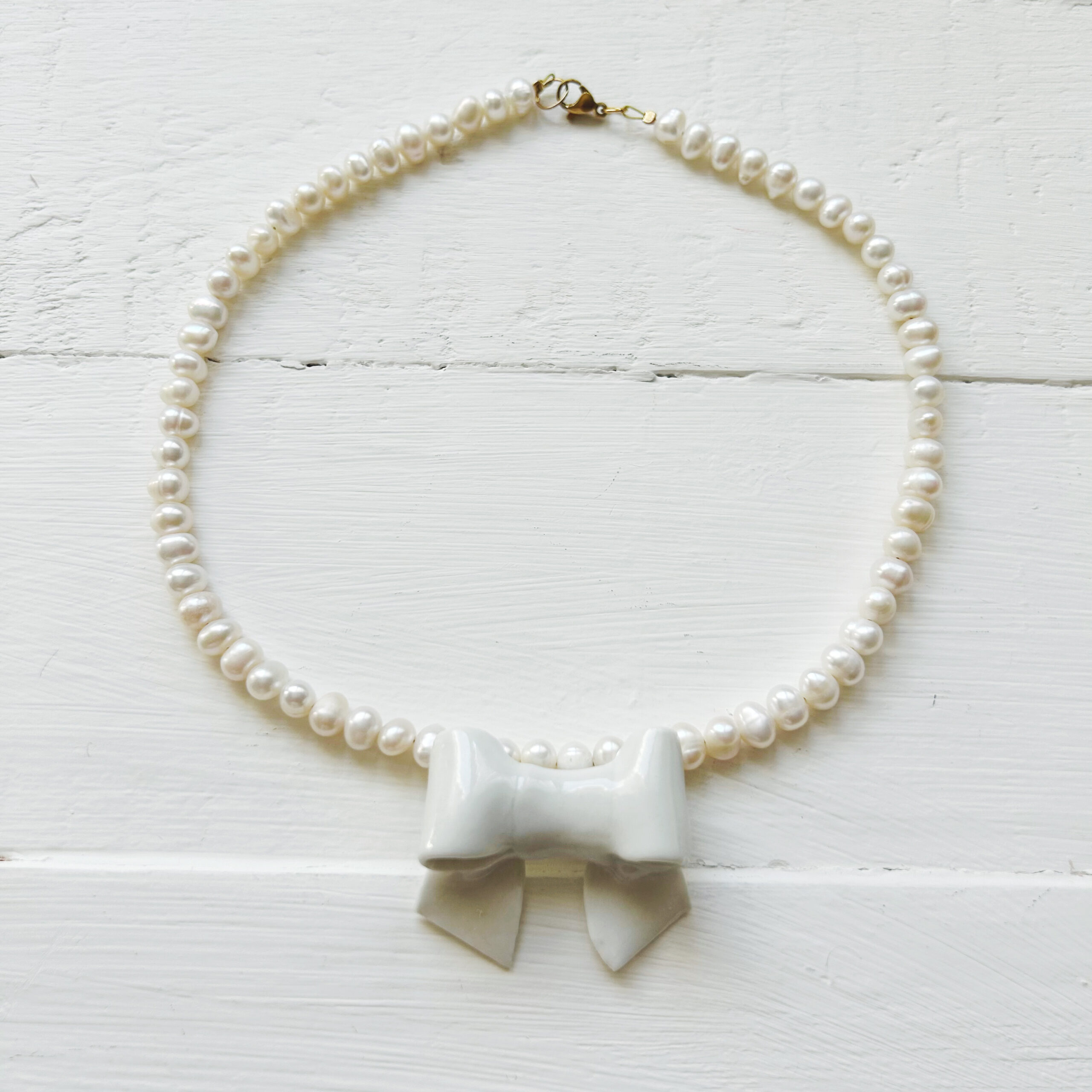 Collar de perlas cultivadas y lazo de cerámica porcelana esmaltada en blanco.